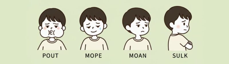 (欲しいものがもらえなくて、彼女はすねてる。) - He’s been moping around all day.
