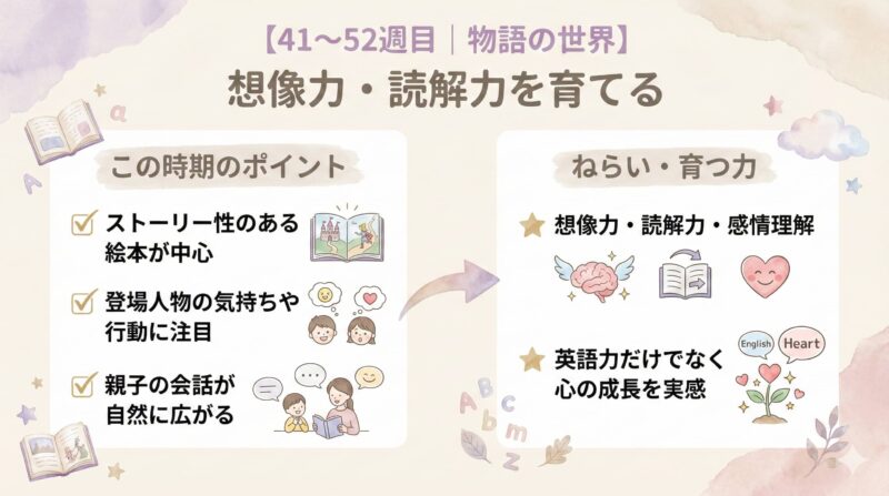 物語性のある絵本を通して、英語を「想像しながら理解する」体験を増やしていくステージです。