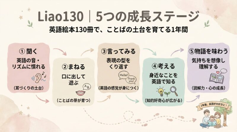 『Liao130』は、英語絵本を130冊集めただけのリストではなく、子どもの英語力が段階的に育つよう、流れそのものが丁寧に設計されています。